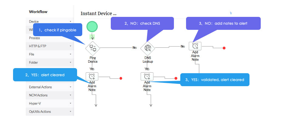 The NMS platform provides custom workflow orchestration that executes custom internal alarm handling, external software processing, or configuration actions when monitoring detects changes in custom device status, processes, applications, files, etc.